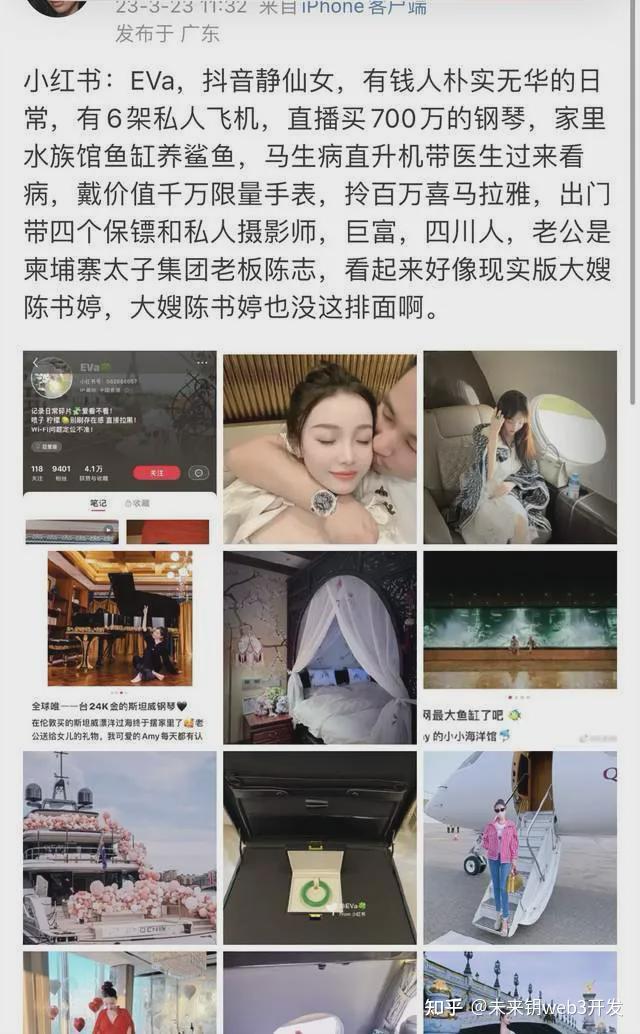 陈志的网红妻子,四川南充人,李彩云(Eva)。这位网红是太子集团及陈志奢靡生活最忠实的记录和展示者.在她的社媒中,我们看到了挥霍赃款的极致浮华